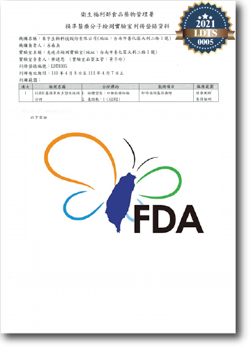 光晟健康集團-免疫力檢測實驗室,榮獲通過台灣衛福部食藥署精準醫療分子檢測實驗室(Laboratory Developed Tests and Services, LDTS)的列冊登錄實驗室(認證編號:LDT0005)及符合美國食品藥品監督管理局FDA許可,為國際上最具權威及代表性的國際標準規格機構。