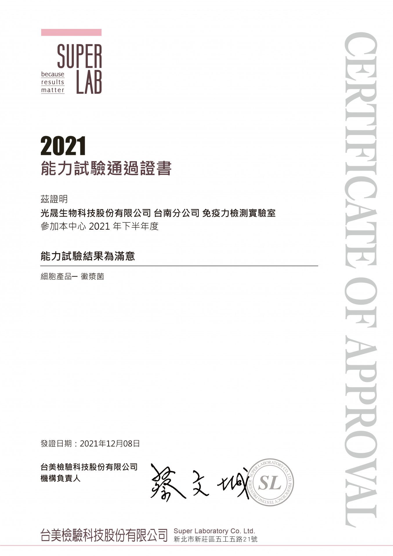 南科廠之免疫力檢測實驗室,參加台美檢驗中心2021年上半年度,細胞產品「黴漿菌」能力試驗結果為滿意。
