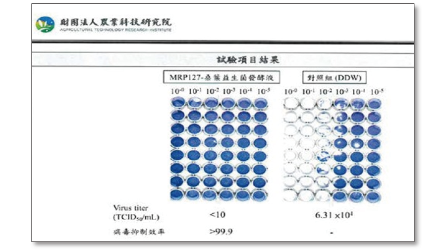光晟生技研發部發現「桑葉與益生菌共生發酵物(MRP127)」具有抗病毒的能力。委託農科院進行抗冠狀病毒測試,結果顯示MRP127抑制99%的冠狀病毒之濃度。