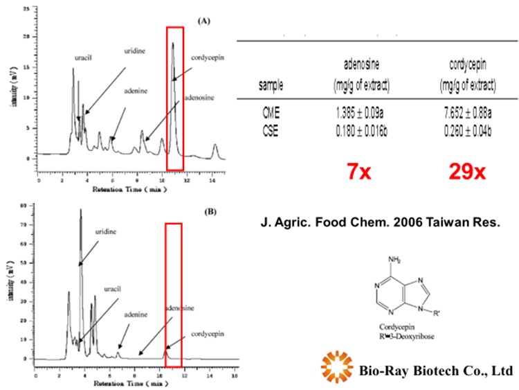專利固態培養基生產高產量、高有效成分之蟲草原料。北蟲草之蟲草素(codycepin)含量為野生蟲草的29倍。